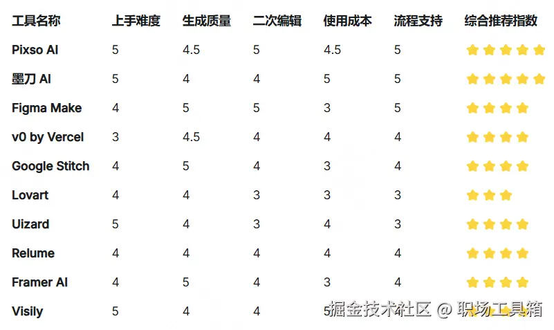 横向对比矩阵:10 款 AI 设计工具核心指标打分