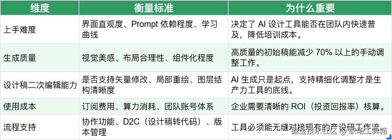 评估工具时,别光盯着宣传片里的效果图看。作为 AI 设计工具的服务使用方,你得关注下面这 5 个维度,包括上手难度、设计稿生成质量、设计稿二次编辑能力、使用成本、流程支持。