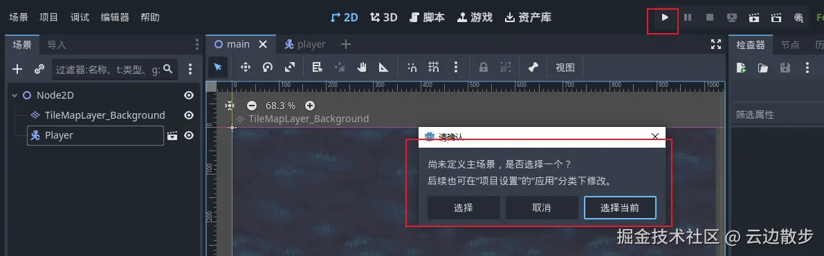 - 我们首先来设置打开游戏选择的场景,当我我们点击上面的播放按钮就是进行启动游戏,不过我们没有选择哪一个场景做启动游戏时的场景,所以我们点击选择当前场景作为启动游戏时的场景