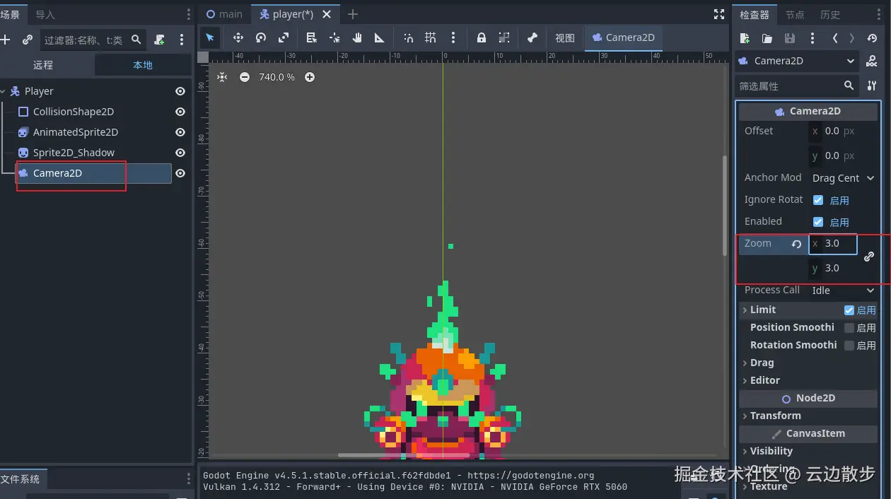 Camera2D,使画面始终以玩家为中心进行显示。最后,通过调整摄像机的缩放参数,优化了游戏画面的显示效果,使整体视角更加清晰、符合实际游玩需求。