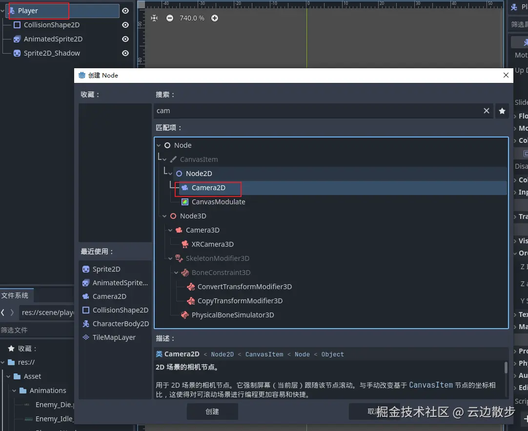 - 然后我们会发现我们的玩家角色没有显示在游戏界面上,看不到我们的玩家角色,我们可以通过设置给玩家添加摄像机解决这个问题。godot是给每一个场景添加了一个默认的摄像机,当场景中没有摄像机时就会启用默认的摄像机,但是这个默认摄像机是指向另外的地方,所以我们会看不到。一旦我们设置了我们的摄像机,默认摄像机就会被覆盖并且不再启用。所以我们在玩家场景中让我们搜索并添加一个Camera2D节点
