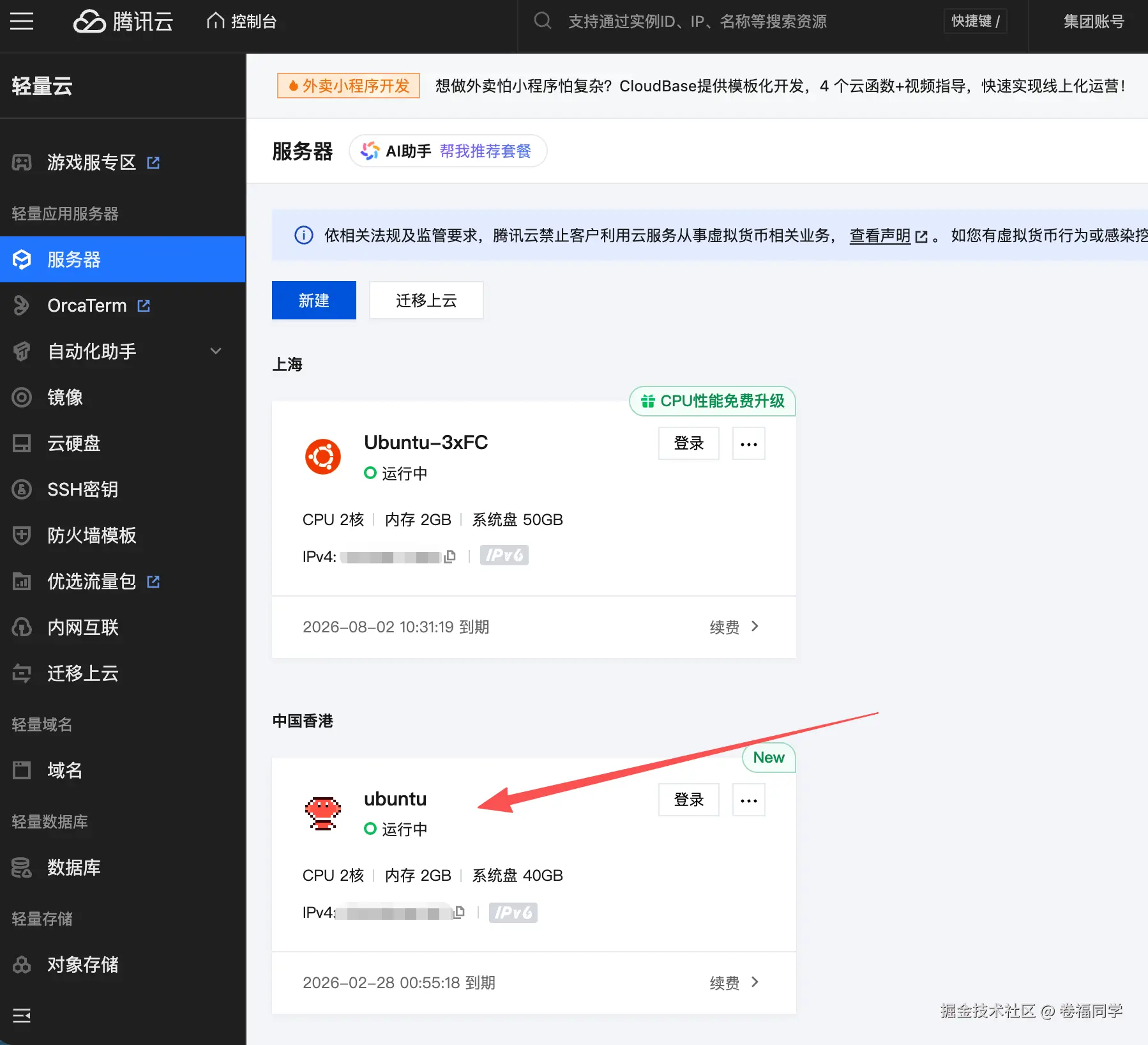 购买完成后,我们接着登录服务器进行配置