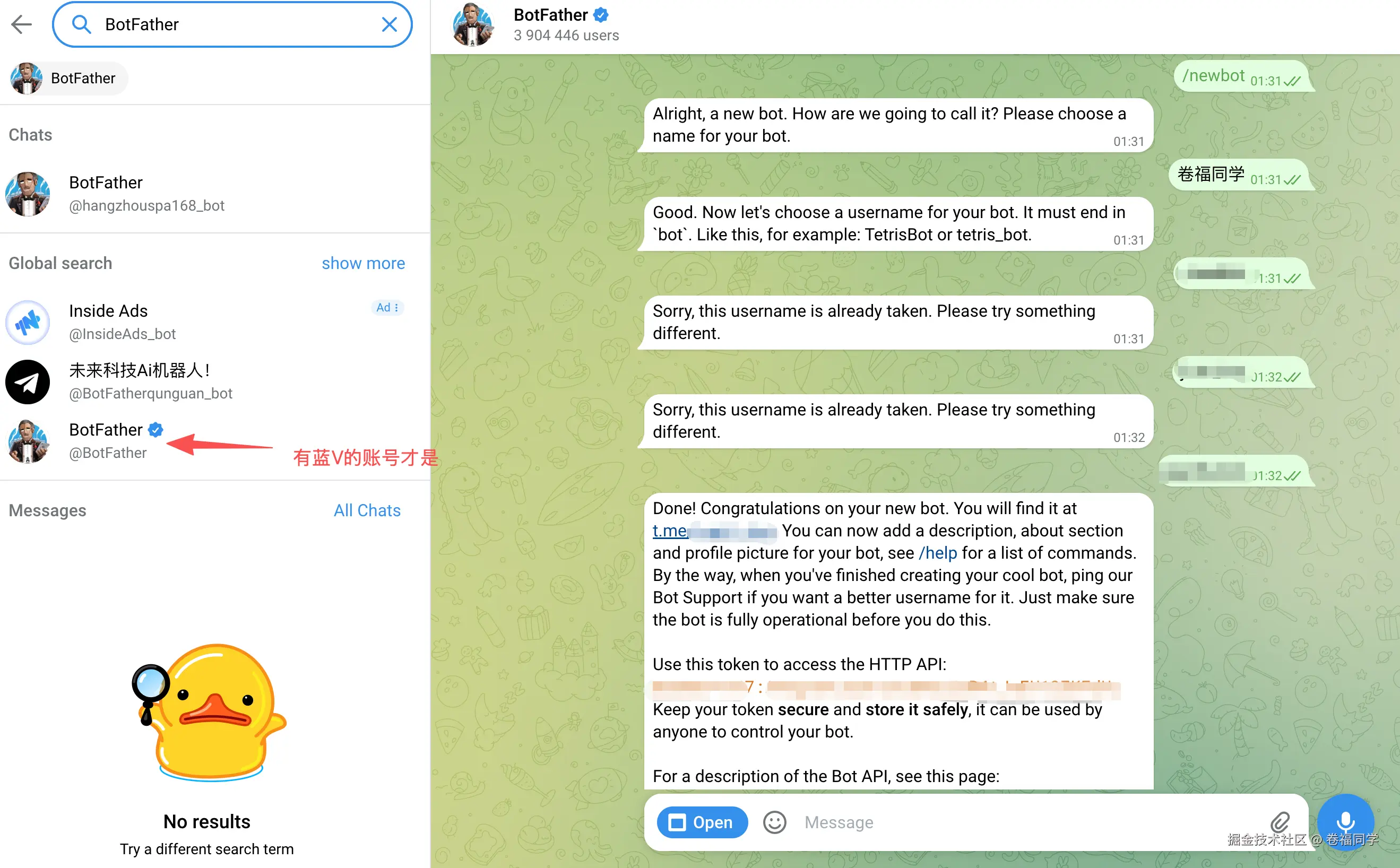 1.打开 Telegram(需要自己安装或者使用网页版),搜索 @BotFather
