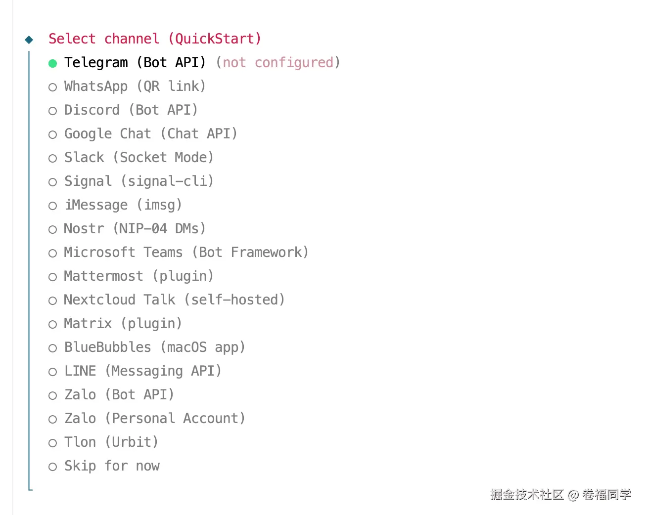 这里官方支持的聊天软件都是国外的,我们基本是不会用到的,所以小卷用telegram作为演示