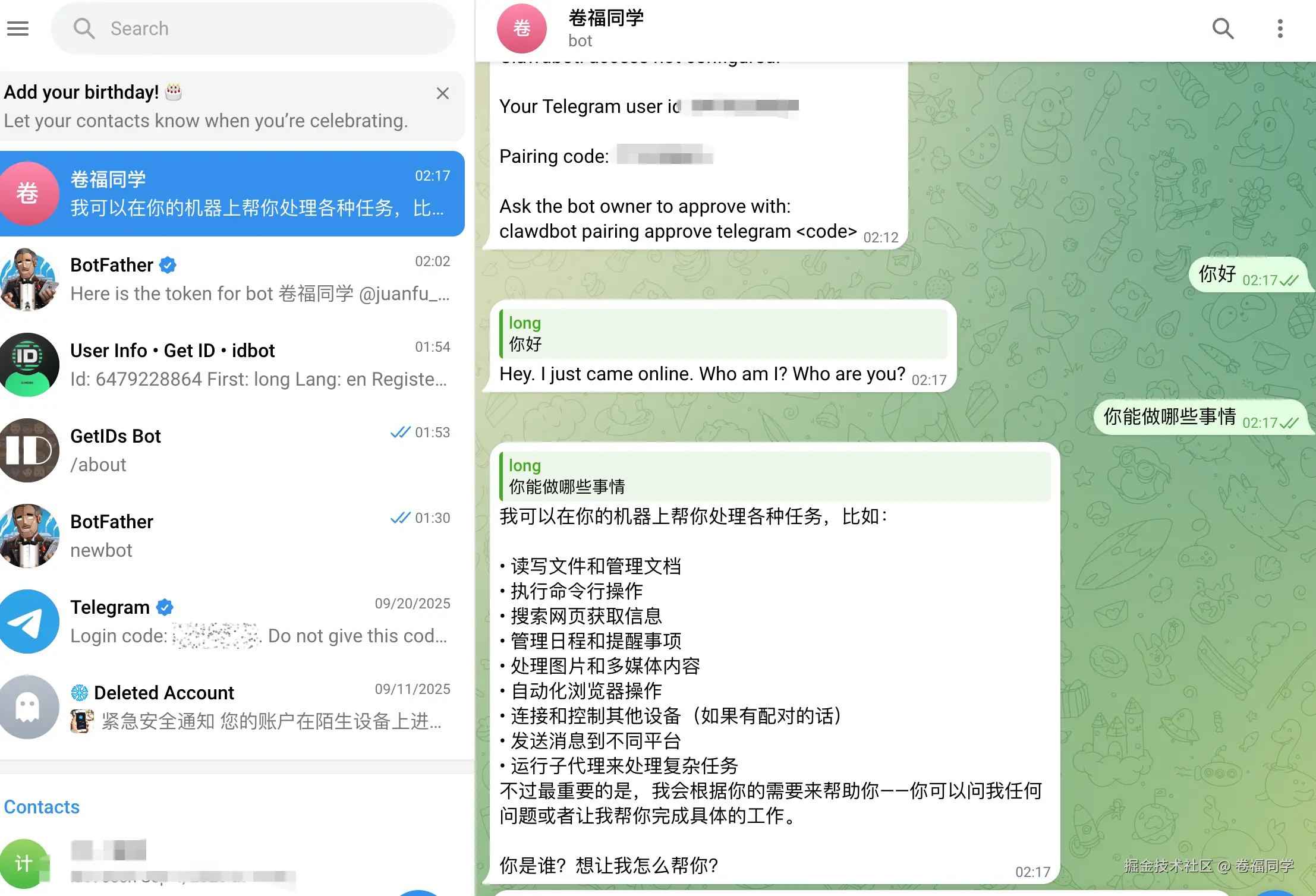 然后在 Telegram 里获取配对码,发给 AI: