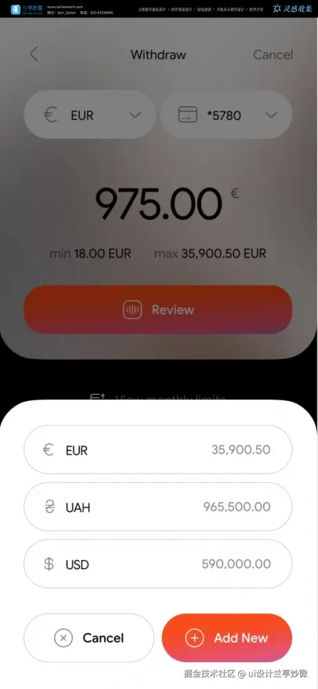 大字号显示提现金额 “975.00 €”,并标注上下限(min 18.00 /max 35,900.50),符合金融场景的严谨性。