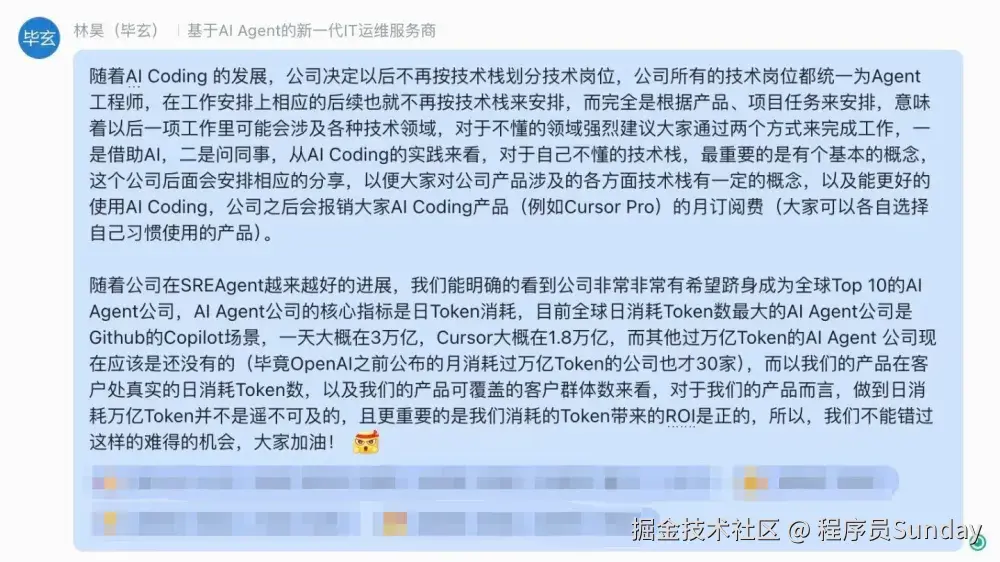 起因是:阿里的前 P10 员工毕玄发了一则飞书,提到:“公司决定以后不再按技术栈划分技术岗位,所有技术岗位统一为 Agant 工程师。并且以后的 工作也不会按照技术栈来安排 ”