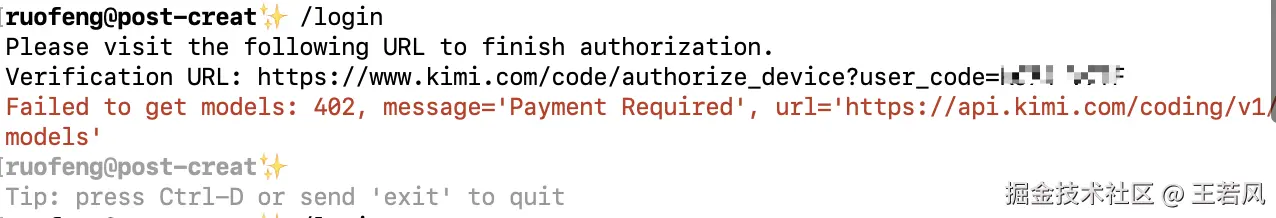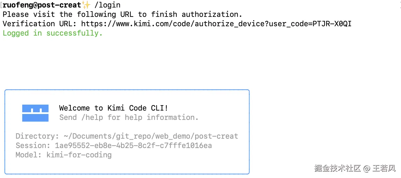 如果顺利回到 CLI 将看到下面的画面,Model 给你设置好了,用的是他们的 kimi-for-coding 模型