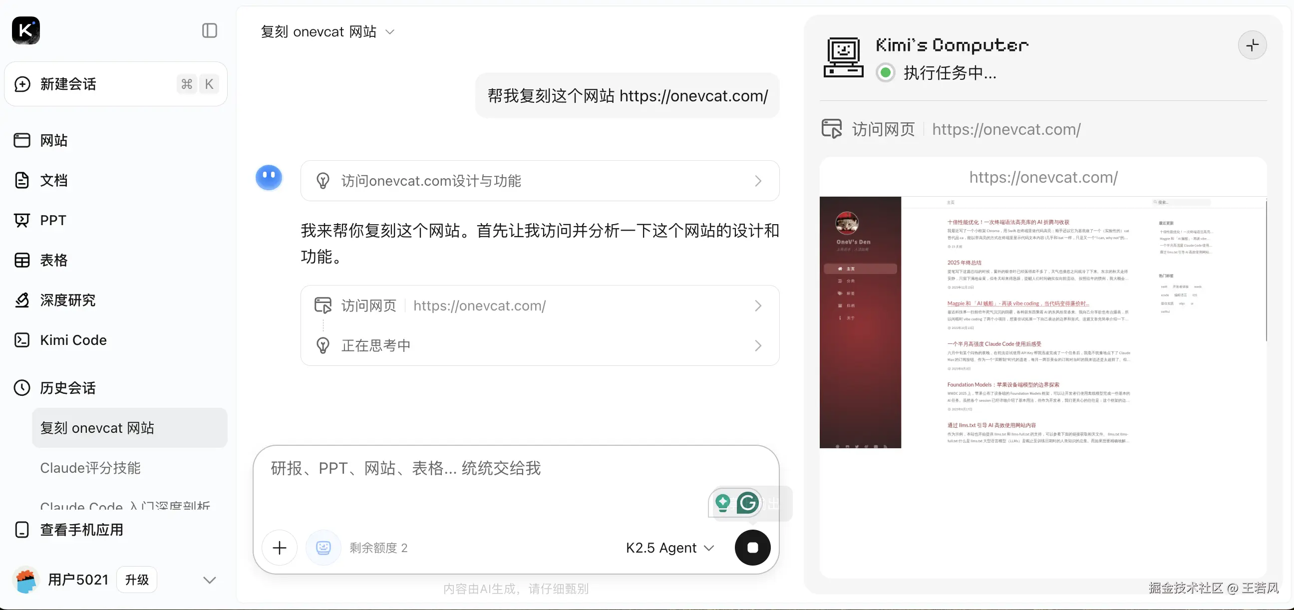 创建完成会自动新构建并部署,部署完成会生成直接可以访问的链接,我的临时网站链接是 c3zvo5t6sfoyc.ok.kimi.link/,这个链接的域名采用了 kimi.link 的子域名