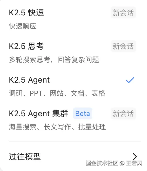 就在不久前, Kimi 上线 K2.5 视觉模型,官方宣传,这个模型不仅能理解图片和视频,还能“像素级”看懂网页设计,进入官网首页 www.kimi.com/zh ,我们可以看到多了几个 2.5 版本带「新会话」标识的模型