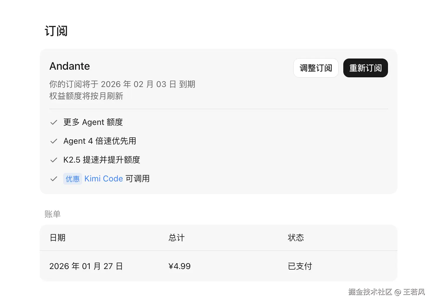 为了给大家演示,购买了一个 7 天的体验套餐 Andante,现在有活动体验价 4.99 米,正式订阅价格变成 49/每月,这个按需选择,不做推荐。