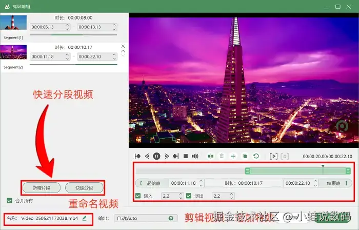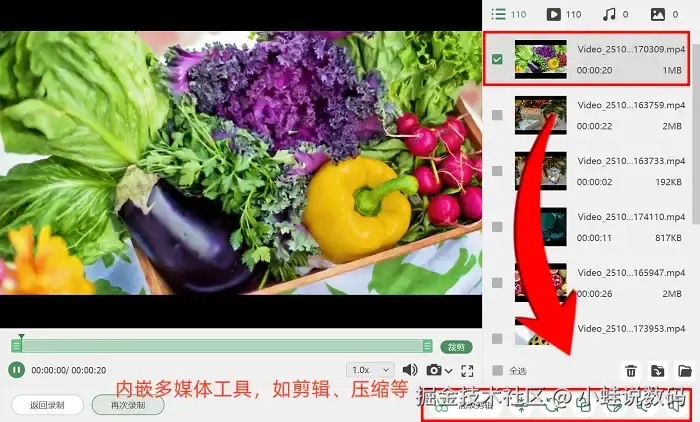第三步:录制完成后,点击页面底部 【高级剪辑】 按钮进入后期编辑界面;在这里能轻松实现视频分段、添加水印及特效等操作,更好地保证视频导出效果!
