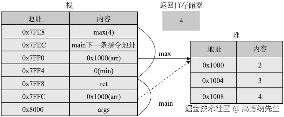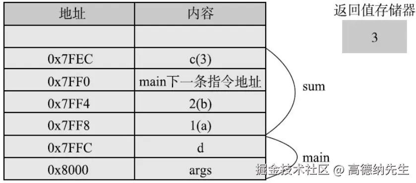 sum被执行期间,先为形参a和b在栈里分配内存。 - 紧接着就是将主调函数的下一条指令地址存进栈里,然后为局部变量
