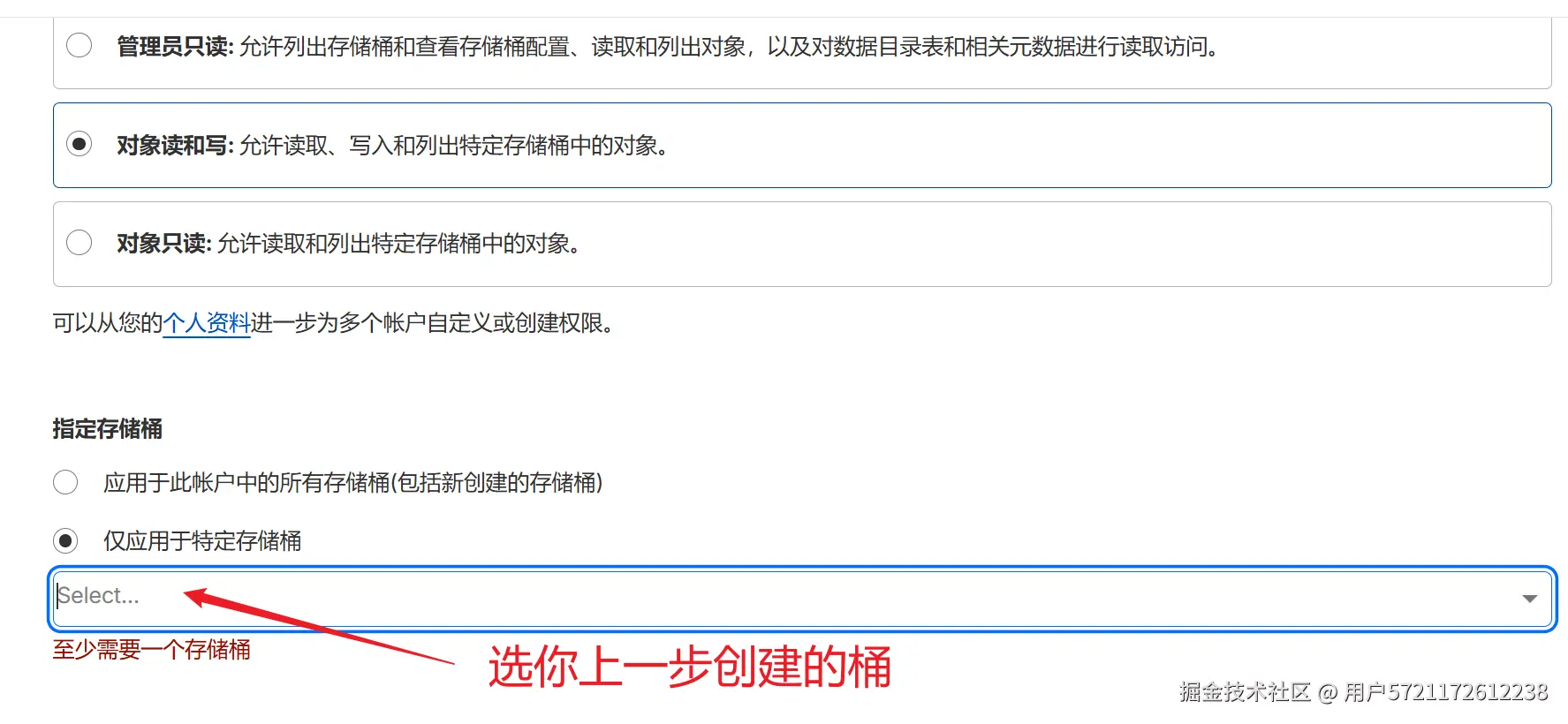 然后权限选 “对象读和写”,指定存储桶选“仅应用于特定存储桶”,然后在下拉框中选择你在步骤2.2中创建的存储桶即可。