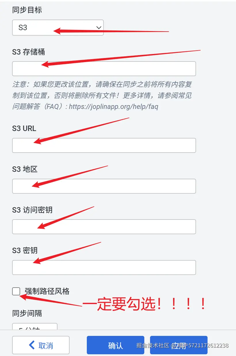 S3存储桶 填:步骤2.2创建存储桶时设置的名字,例如joplin-sync