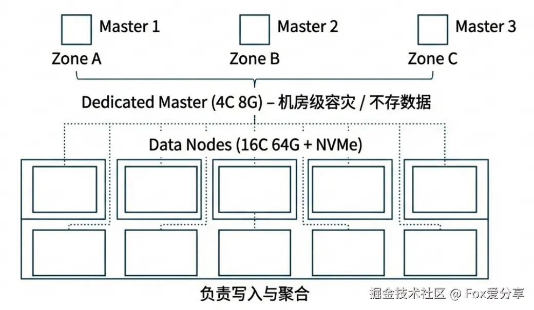 - 关键点:跨可用区(Zone)部署。Zone A、Zone B、Zone C 各一台。即使某个机房光纤被挖断,集群依然存活,这叫机房级容灾。