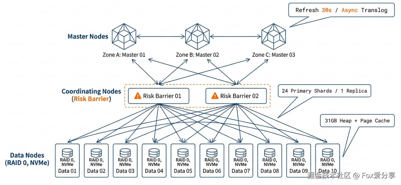 - 容量与分片: 针对日增 1TB 的日志业务,我申请了 10 台 Data 节点(每台 4TB NVMe SSD,组 RAID 0)。依据单分片 30-50GB 的原则,将主分片设为 24,单片约 42GB。