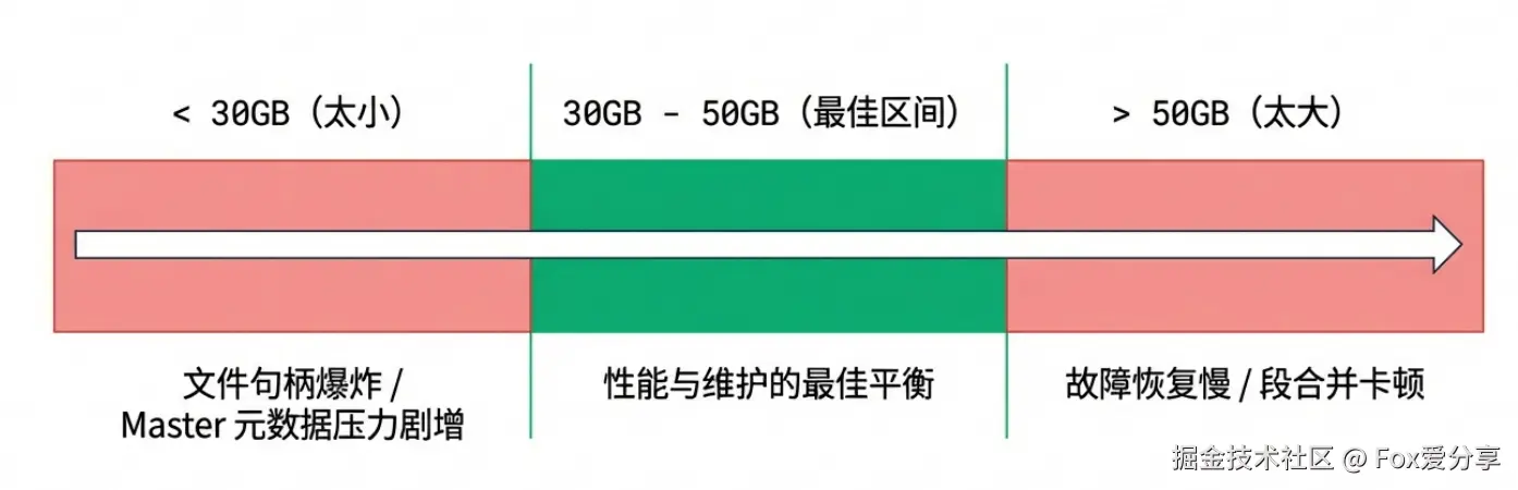 - < 30GB(太小): 分片过多会导致文件句柄爆炸,Master 节点维护元数据压力剧增。