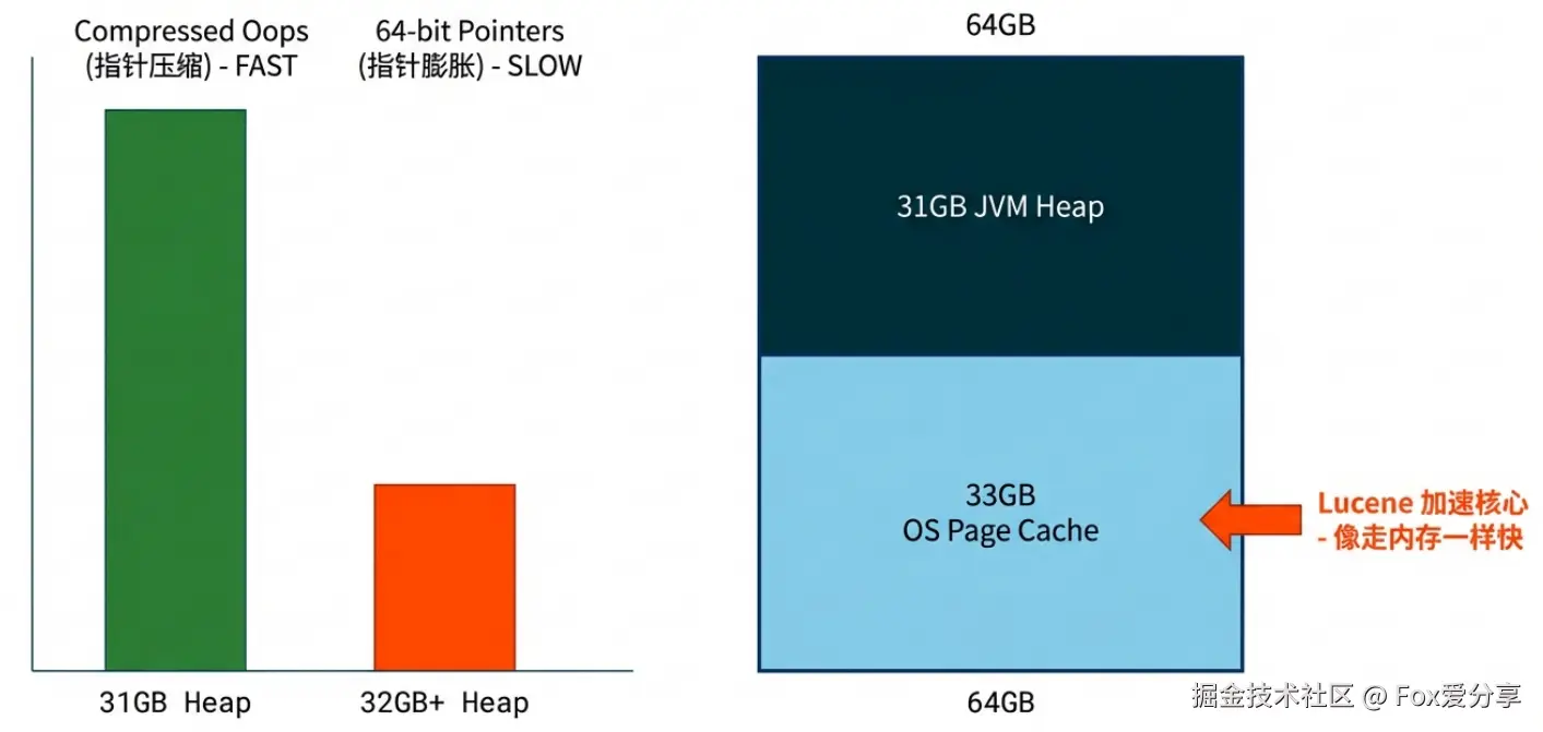 剩下的 33G 去哪了? 全部留给操作系统的 Page Cache!ES 的底层是 Lucene,只有 Page Cache 足够大,查询才能像“走内存”一样快。