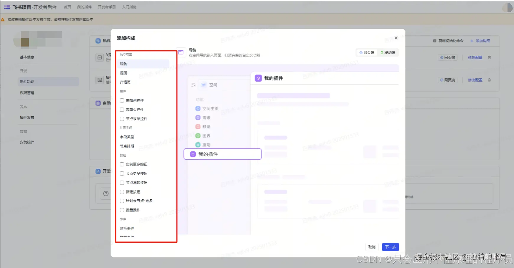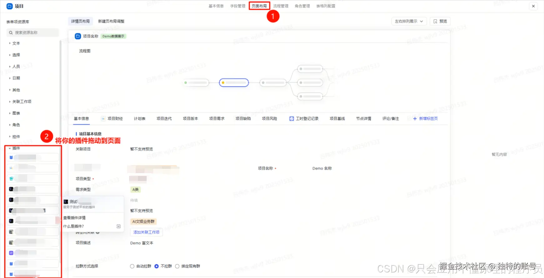 lpm start,启动本地开发服务器。 - 配置插件:以控件为例,首先要在空间配置里的页面布局添加插件。