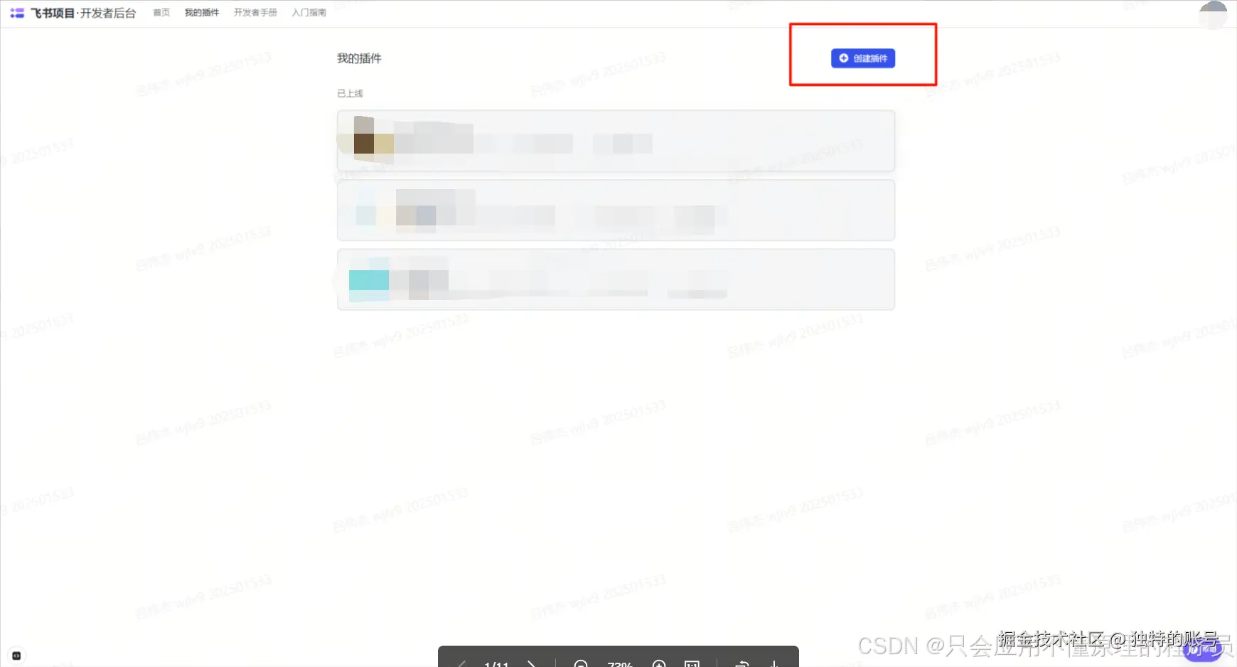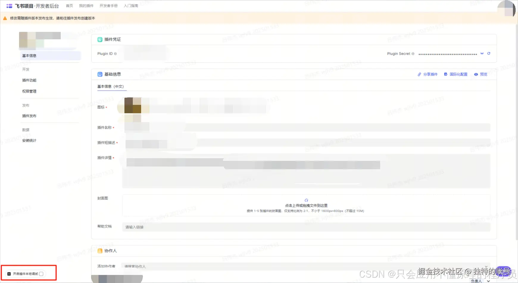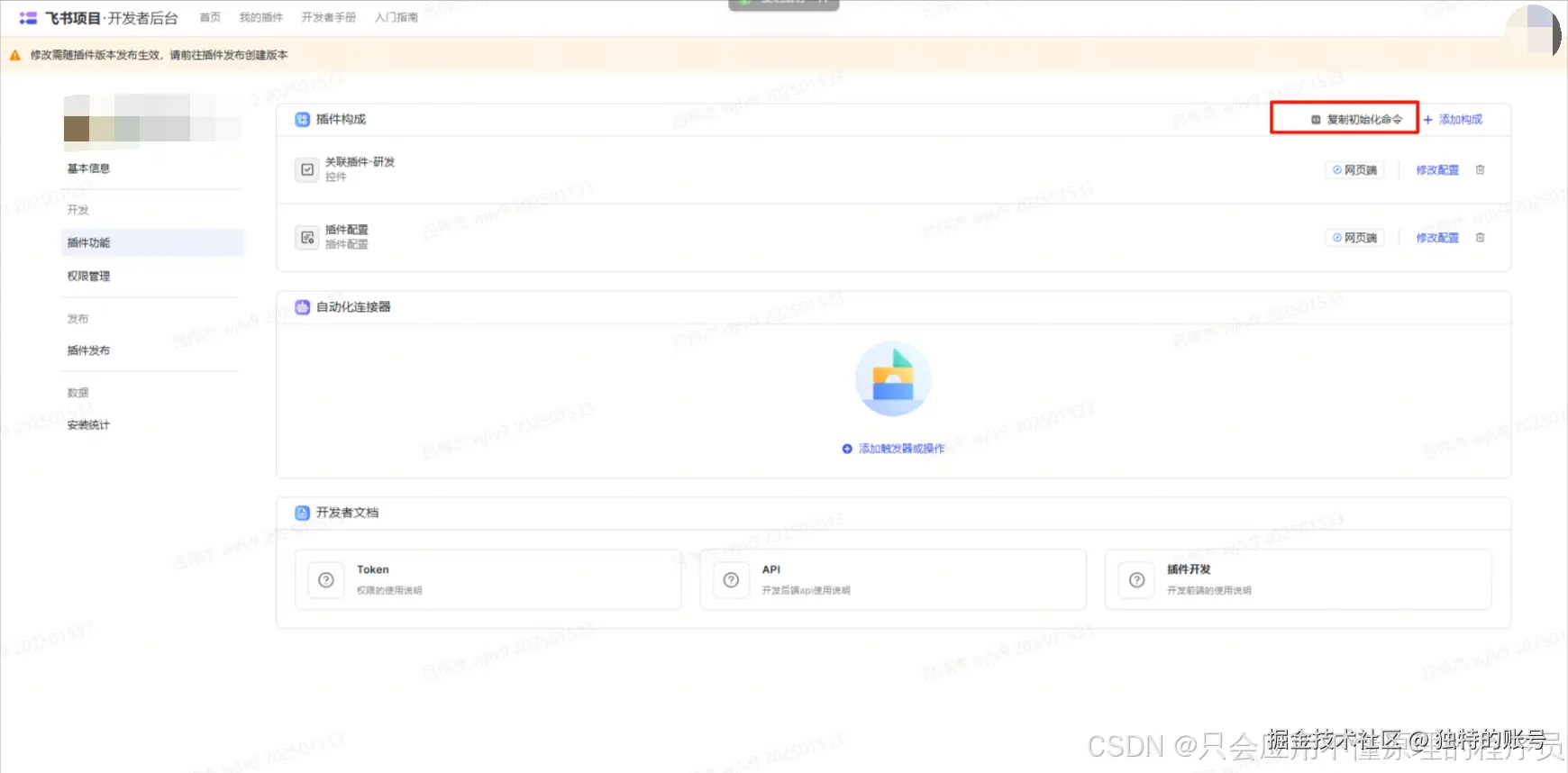 在飞书开放平台上创建一个新的应用,获取 Plugin ID 和 Plugin Secret 等关键信息,并初始化项目。