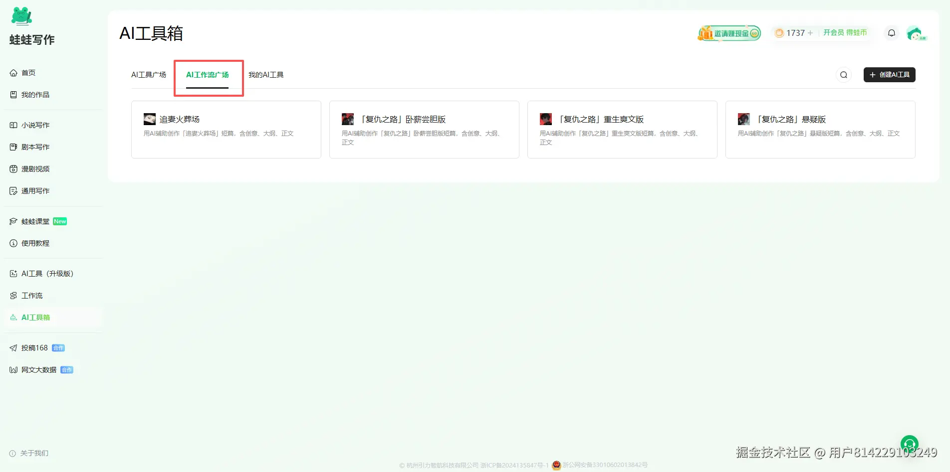 此外,平台内置AI工具广场,涵盖灵感抽卡、AI审稿等垂直功能,支持小说、剧本、漫剧脚本多体裁创作,后续可将小说文本一键转化为带动态分镜和专属配音的漫剧视频,实现 “文本 - 视频” 全链路输出。