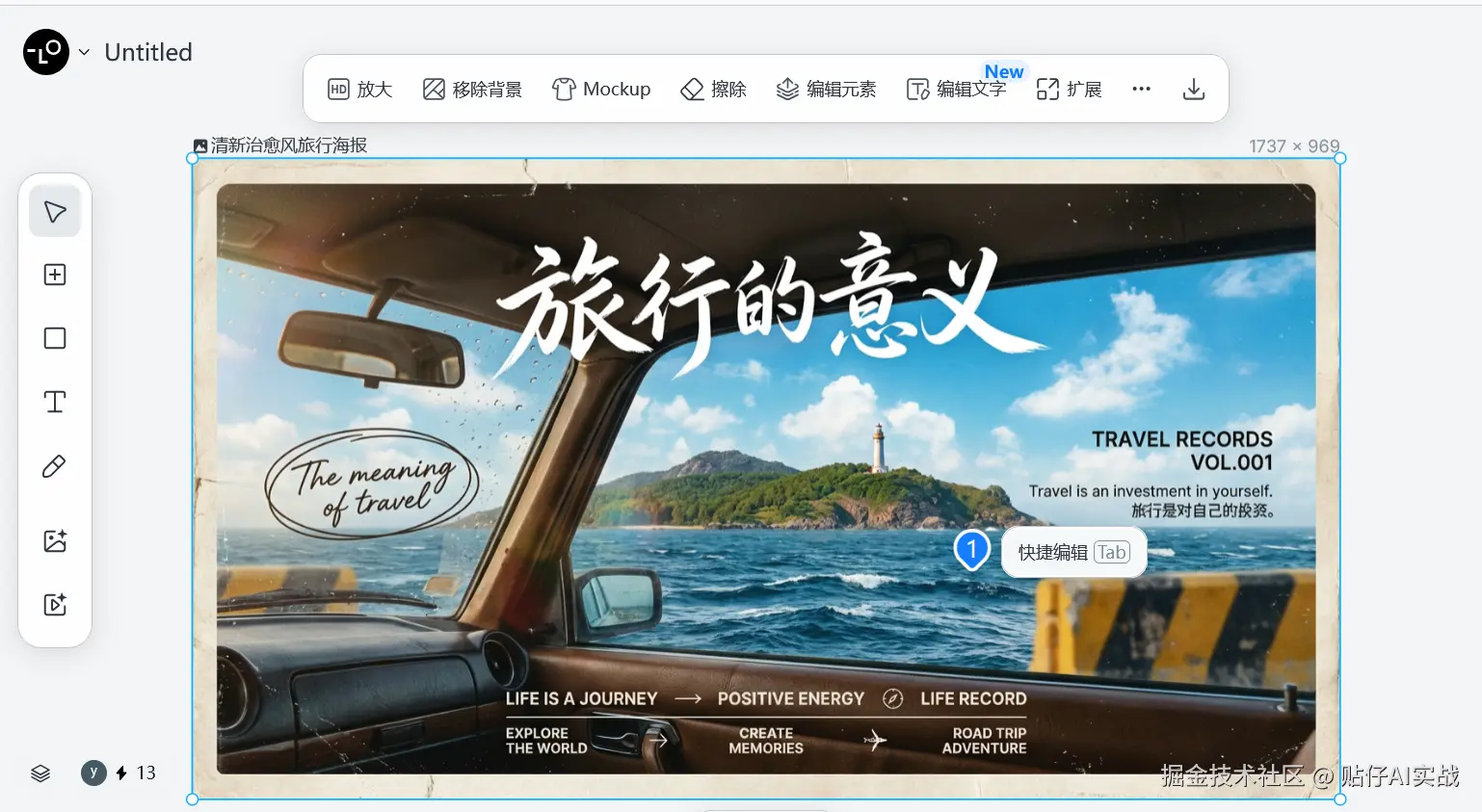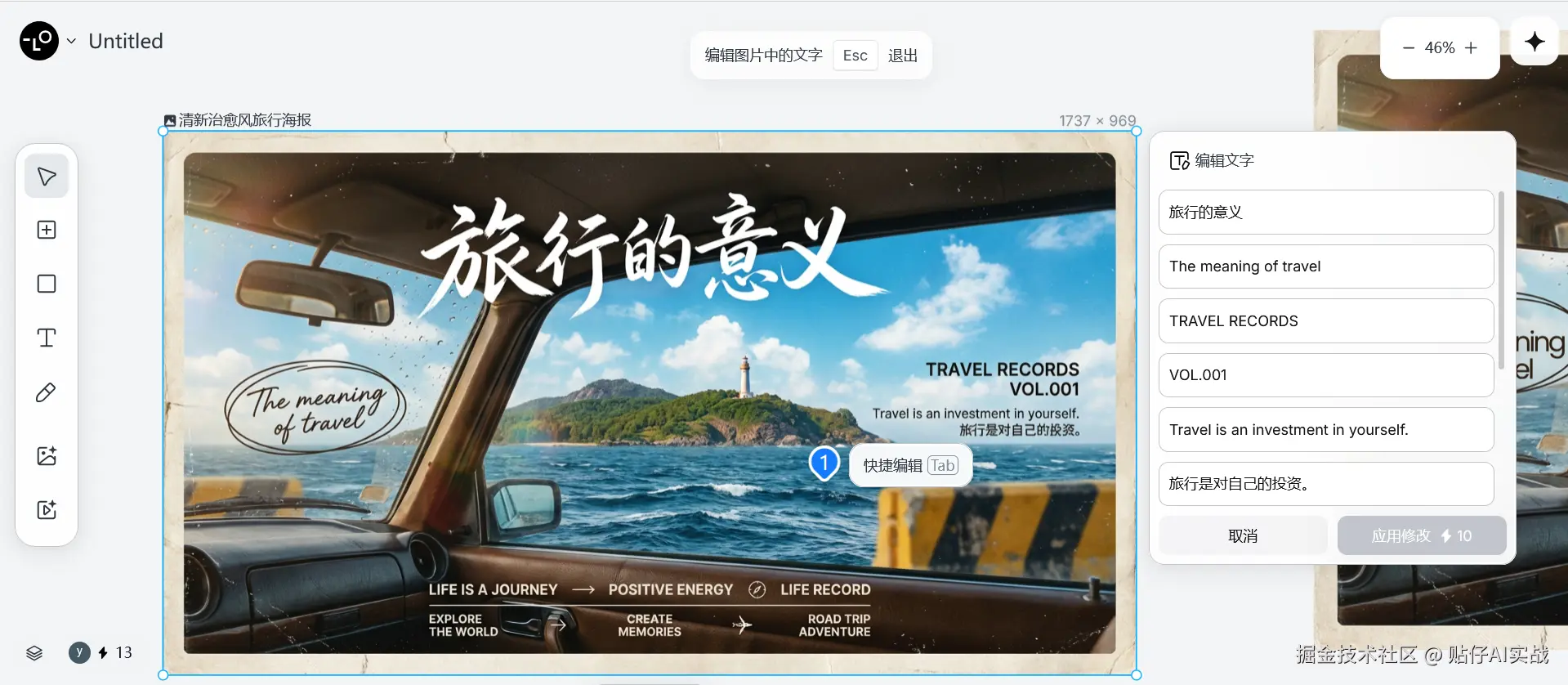 - 便捷性: 一般,它直接生成的结果还是一张图片,没有图文分层,如果想要编辑其中的元素,你需要点击“编辑元素”,然后它又会花两分钟的时间生成图文分层的结果,如果你想只修改文字,要点击“编辑文字”,然后它会只识别文字供你编辑。