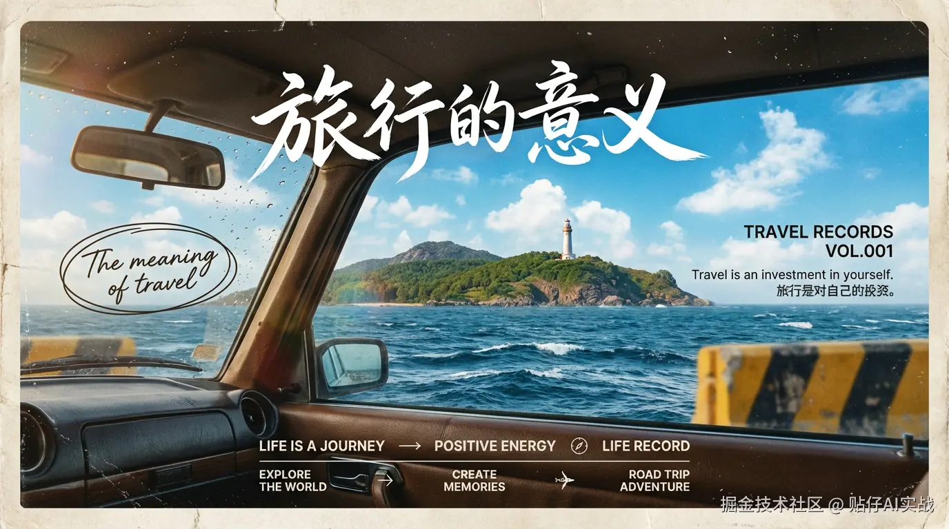 “清新治愈风旅行主题海报,采用车内第一人称视角(透过车窗拍摄),层次构图(前景呈现车内后视镜、车门框、黄黑条纹防撞护栏,远景展现海岛、灯塔、海面与蓝天);画面整体带有胶片摄影颗粒感与柔和电影滤镜质感;主标题 “旅行的意义” 为手写毛笔字体(灵动洒脱,白色),左侧搭配手写花体英文 “The meaning of travel”(白色,以椭圆圈装饰);右侧文字是简洁无衬线字体,包含 “TRAVEL RECORDS VOL.001”“Travel is an investment in yourself. 旅行是对自己的投资。”;底部排布无衬线英文短语 “LIFE IS A JOURNEY”“POSITIVE ENERGY”“LIFE RECORD” 及相关旅行文案;背景是高饱和度清新蓝色天空(点缀蓬松白云)、写实质感的蓝色海面、覆有绿植的海岛(山脚裸露岩石,山腰立着白色灯塔);整体配色以清新蓝为主色调,融合海岛自然绿、车内深棕 / 黑色、文字白色,营造出公路旅行看海的治愈纪实氛围。”