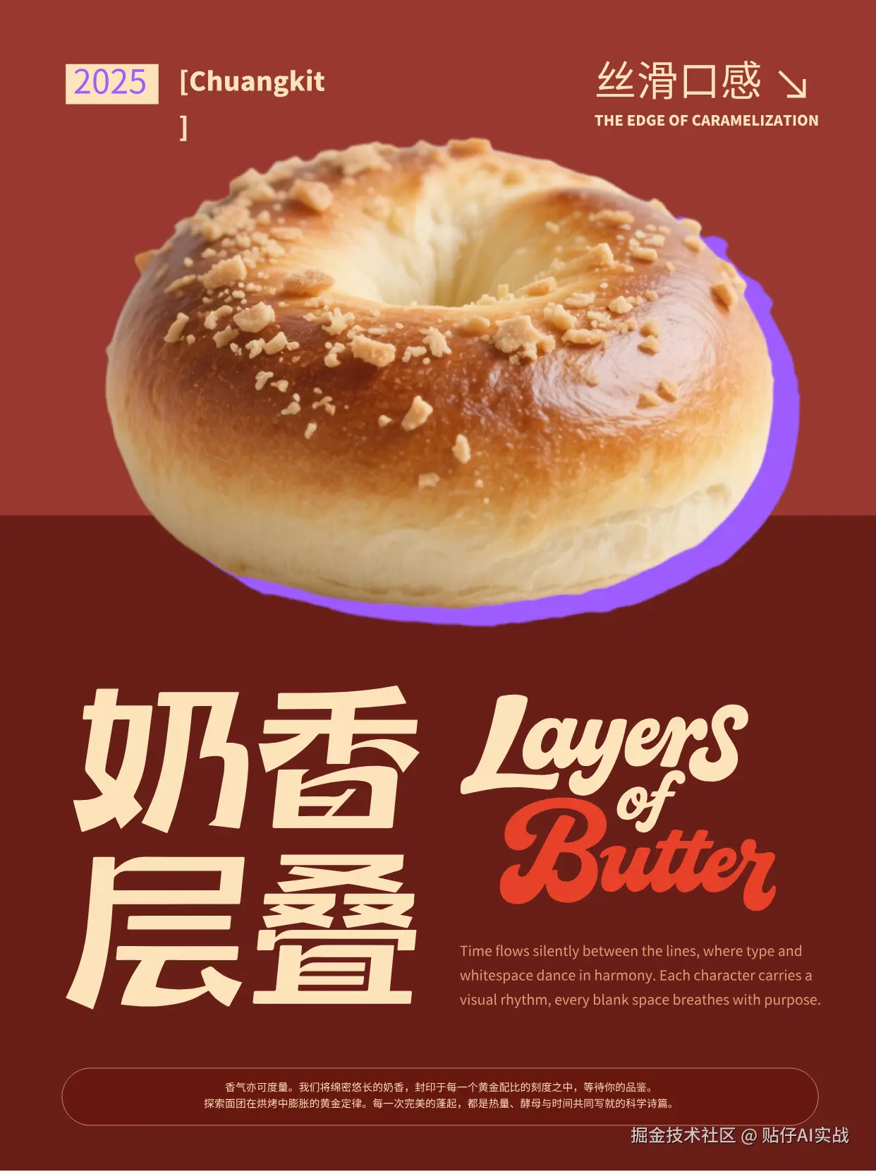 我想让它把贝果变成可颂,发现改图效果还是很惊喜的,细节也处理的很好,产品底部的紫色描边也呈现了出来。