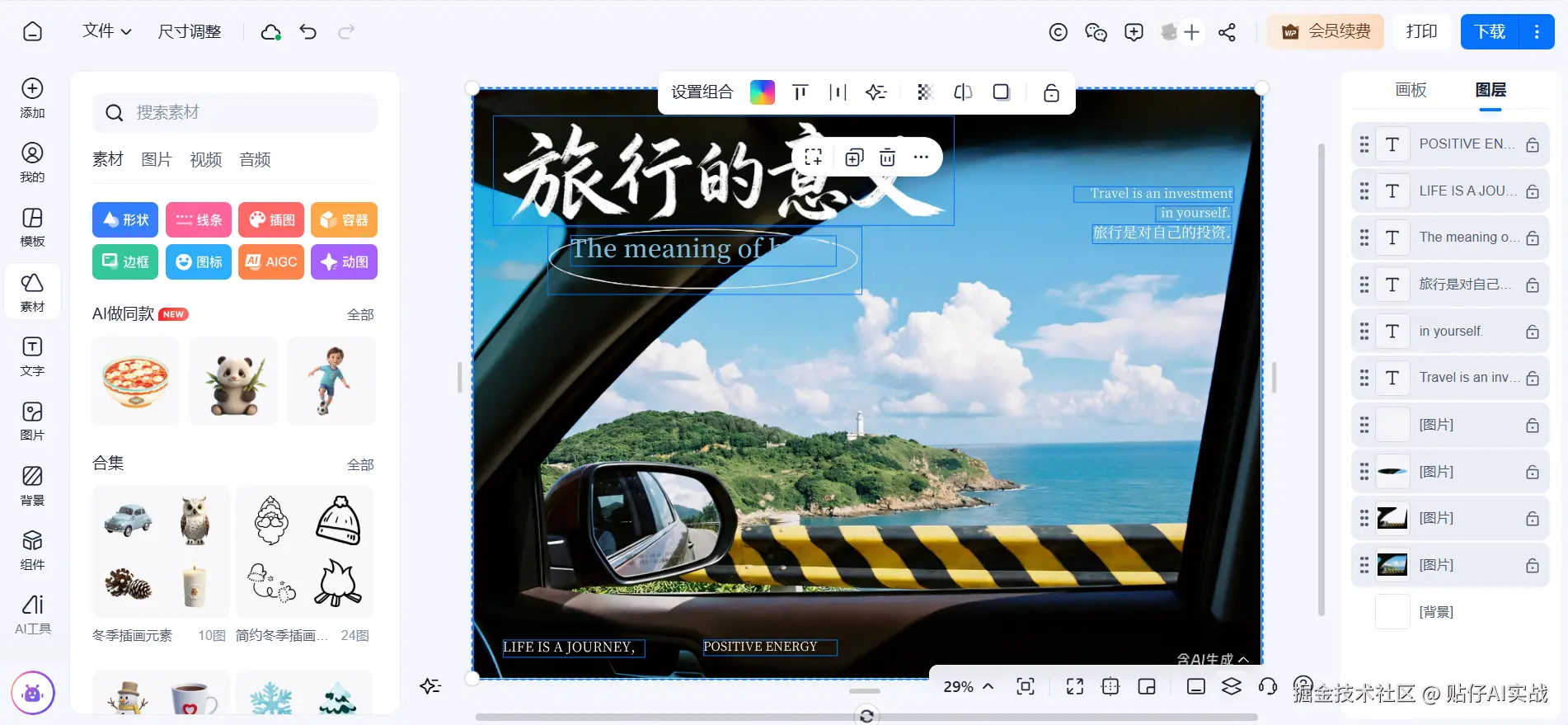 - 精确性: 文字的分离很精准,把所有图层选中之后可以看到,所有文字是都可以编辑的,而且不会改变原字体,这一点比lovart强,但是图片元素也没办法修改。