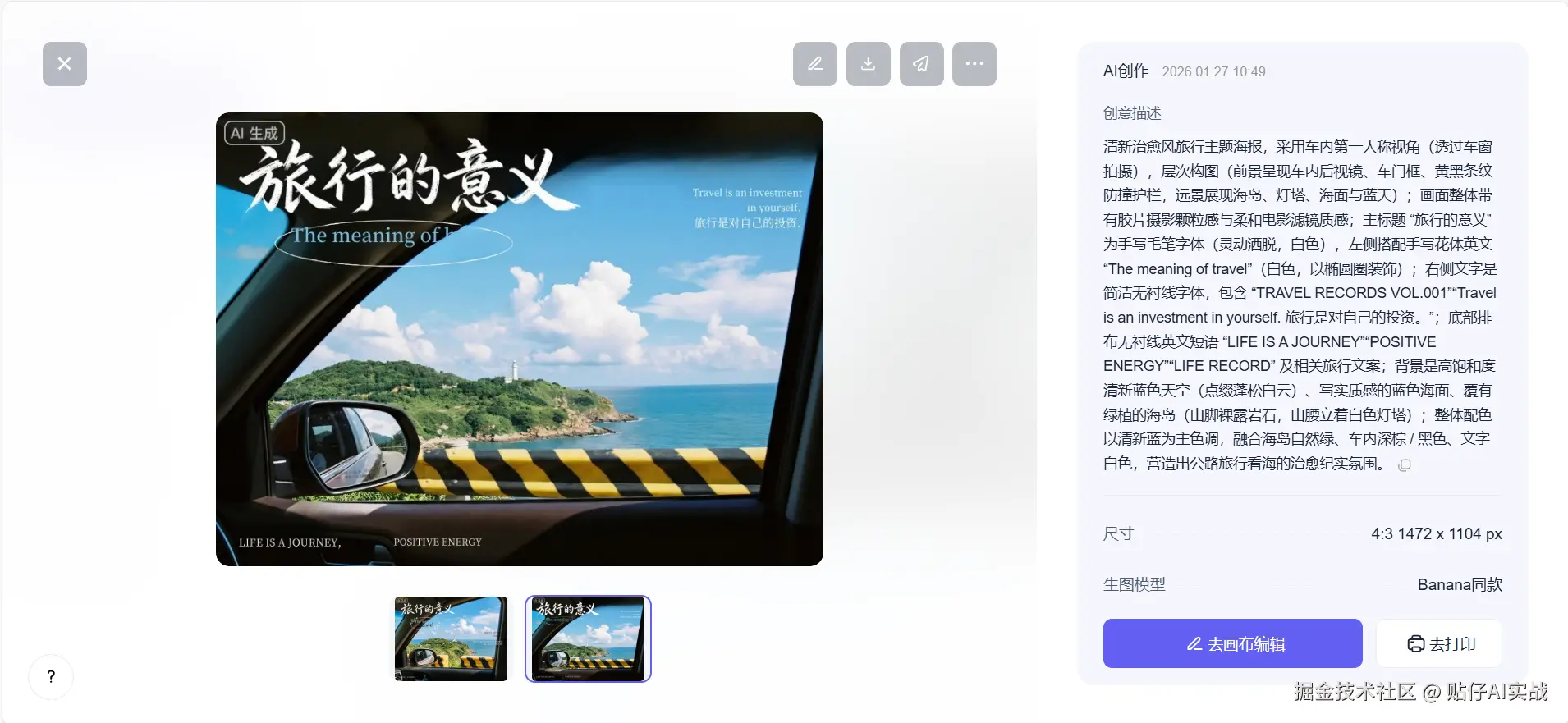 再看它的提示词理解能力,整体上也是符合我的描述的,我提到的关键词像“车内第一人称视角”“层次构图”“胶片摄影颗粒感与柔和电影滤镜质感”以及我提供的文字元素它也都理解并呈现了出来,而且细节也很到位,比如后视镜里的画面更合理。
