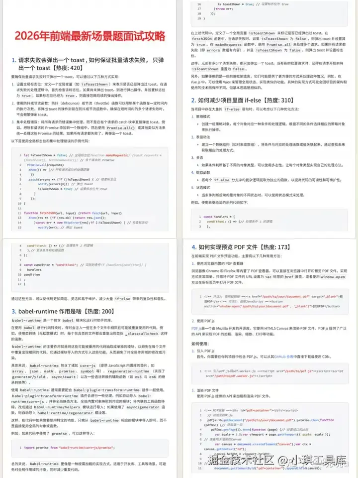 说了这么多核心能力和行业行情,大家最关心的肯定是——怎么把这些能力落地,顺利通过面试、拿下心仪的offer?毕竟风口再利好,过不了面试这关,也只能望而却步。结合近期多家企业的前端面试真题,我整理了对应这5大核心能力的高频面试题,每道题都贴合当下招聘痛点,帮你精准避雷、高效备考,把能力转化为实实在在的录取通知书,接下来就逐一和大家拆解: (需要的看最底)
