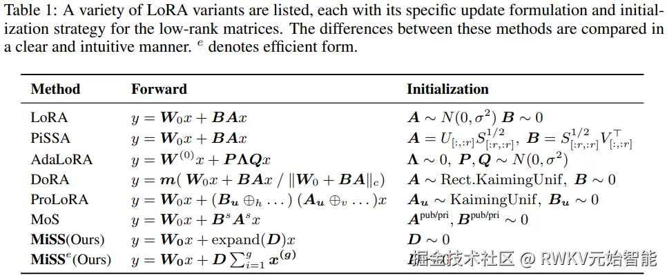 MiSS 论文提出了 MiSS(Matrix Shard Sharing)微调方法。该方法采用了一种高效的“分片共享”结构,将预训练权重矩阵分解为多个片段,并仅使用一个共享的可训练矩阵(初始化为零)通过复制机制来构建低秩更新,从而替代了 LoRA 需要同时优化两个耦合矩阵( 和 )的传统方式,将优化问题简化为针对单一矩阵的求解。