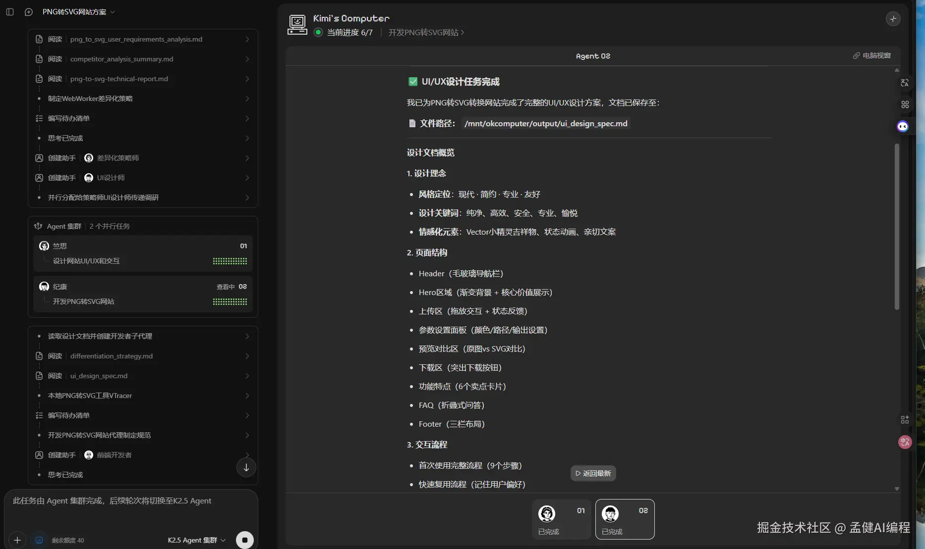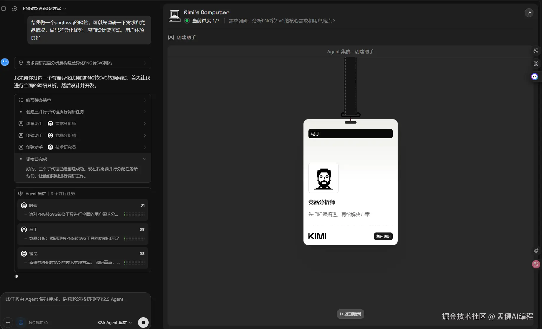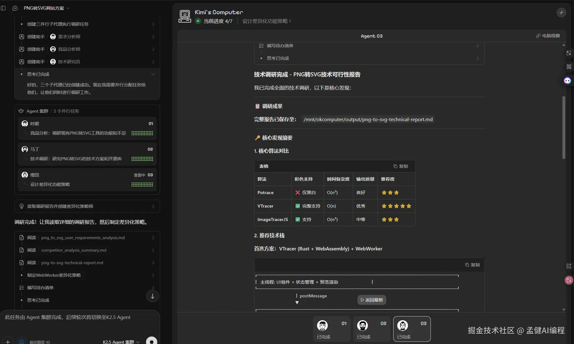 然后,Kimi 自动创建了三个 Agent 并行工作: