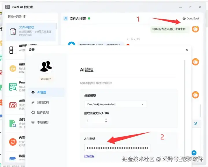 软件,默认是DeepSeek模型,需要在右上角设置模型的密钥。
