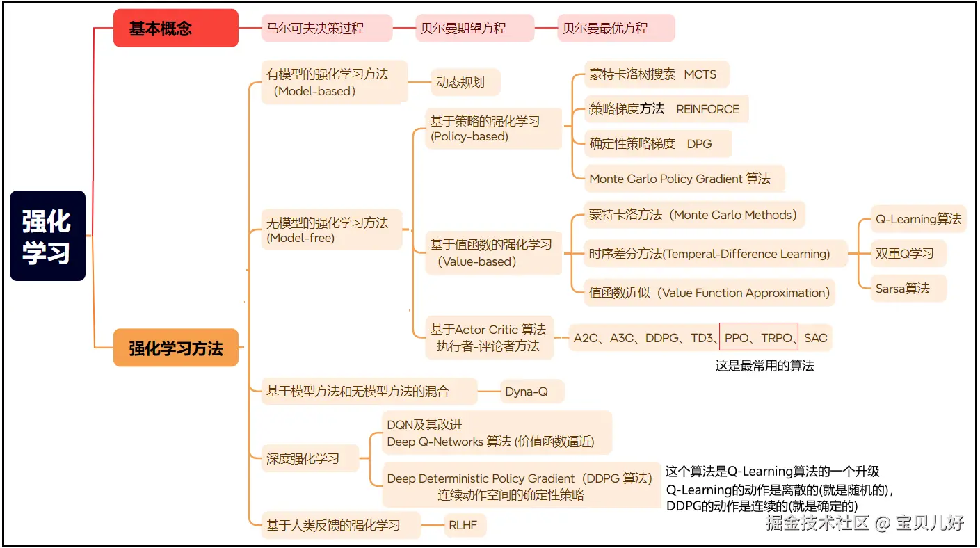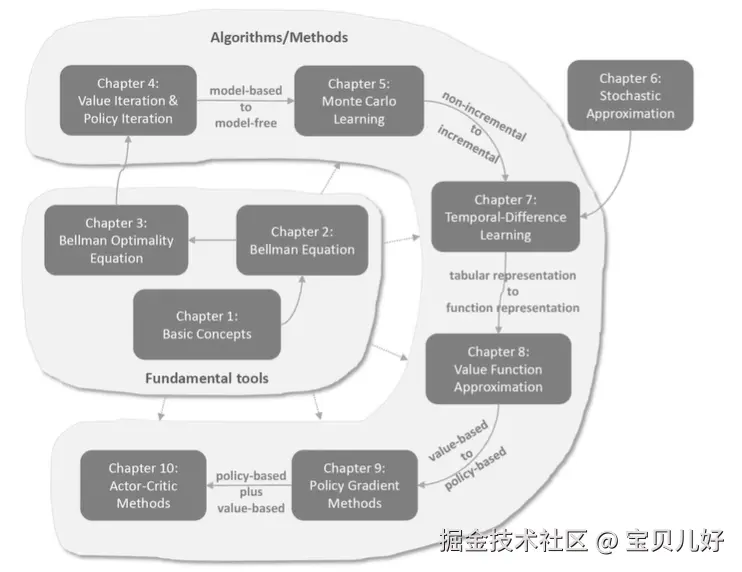 从上图我们可以看到:强化学习的理论部分又分基础概念/工具和算法/方法两个部分。
