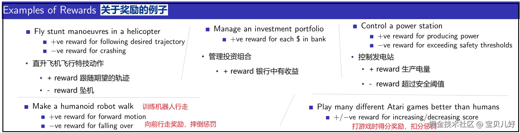 3、Reward:就是我们前面说的强化学习本质上是基于奖励信号驱动的试错学习中的奖励信号的意思。reward也有多种翻译:奖励、奖励信号、即时奖励、反馈、反馈信号、即时反馈等等,这些都是reward的意思。指的都是agent在某个state下采取了特定的action后,所得到的即时反馈。或者说是Agent在时间步t的奖励Rt。在强化学习中reward是一个标量,也就是一个实数。