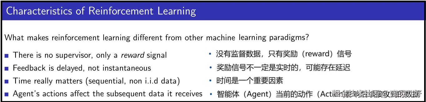 所以强化学习和监督学习、非监督学习的底层逻辑完全不一样,它有其自身的特点: