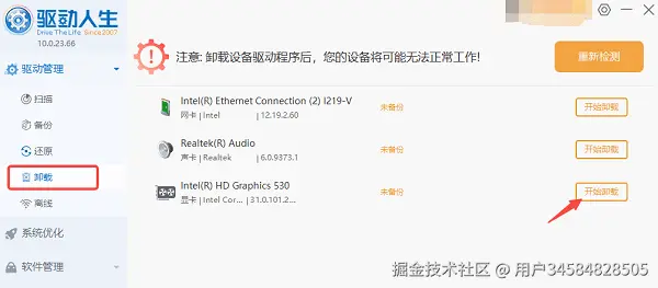 - 备份完成后,进入“卸载”页面,找到显卡驱动开始卸载。