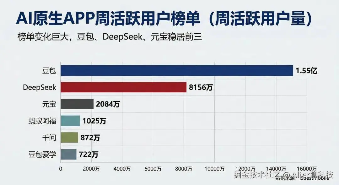 根据QuestMobile2025年12月的调研报告,豆包以1.55亿的周月活跃用户位居第一;作为技术黑马的DeepSeek,在几乎没有大规模投流的情况下,靠着硬核口碑将周活跃冲到了8156万。而背靠微信这座流量金矿的元宝,周活跃仅为2084万,同时还面临阿里系追赶的压力。