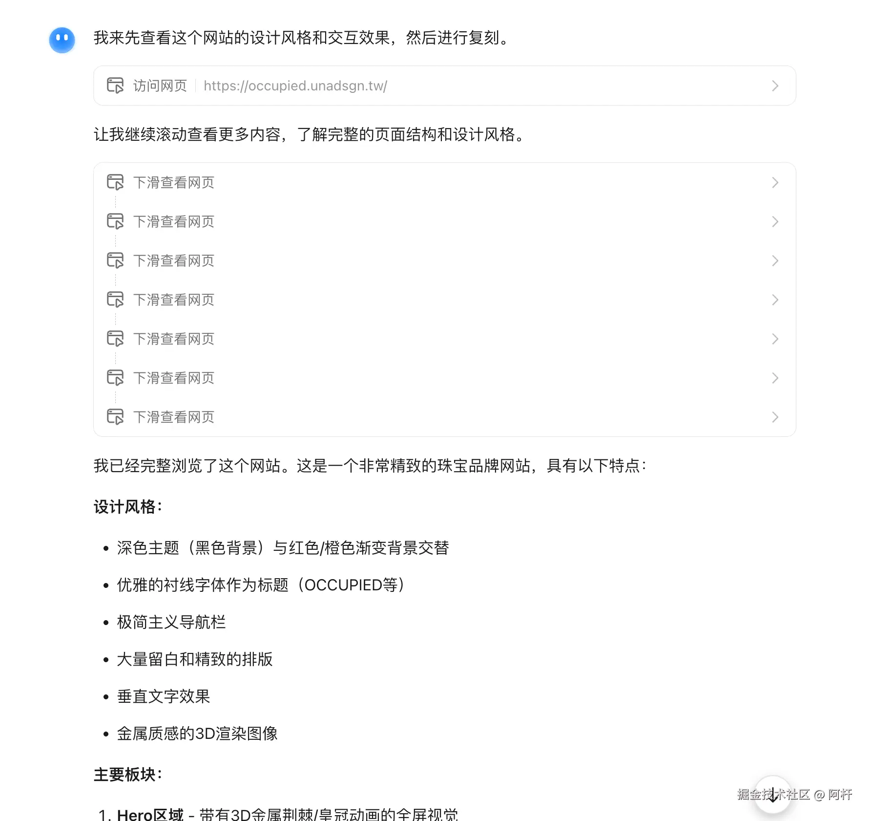 它首先打开并且查看了网站的内容,分析网站的设计风格,然后生成需要的素材图片,最后开始复刻网站。