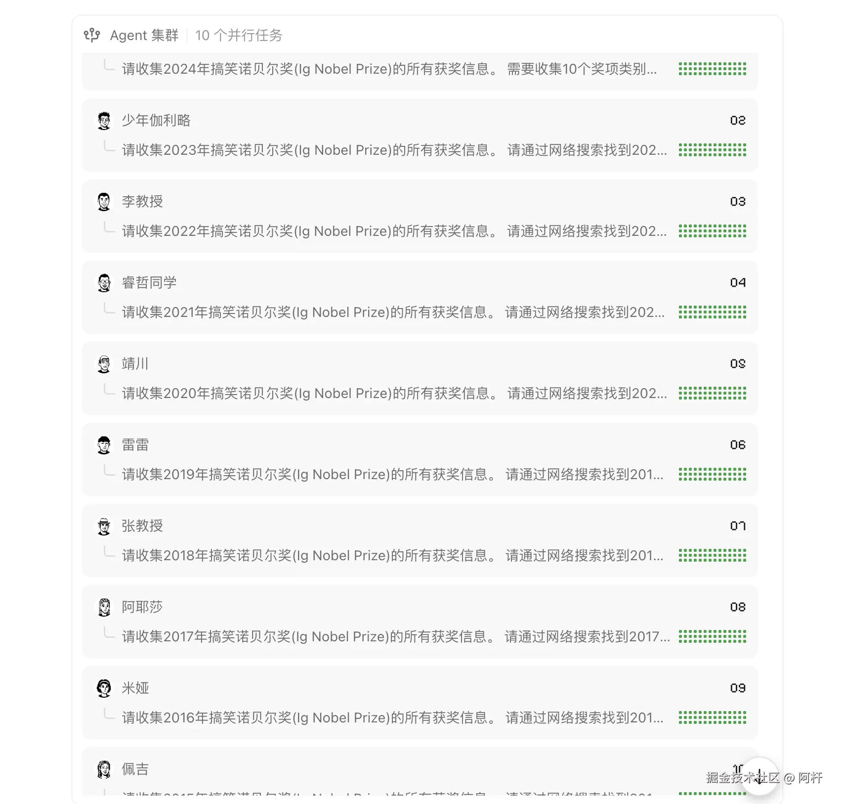 整个过程大约持续了8分钟,我看到它分配了10个Agent,然后每个人分别去查一年的资料,最后刷刷刷给我列出了一个表格!