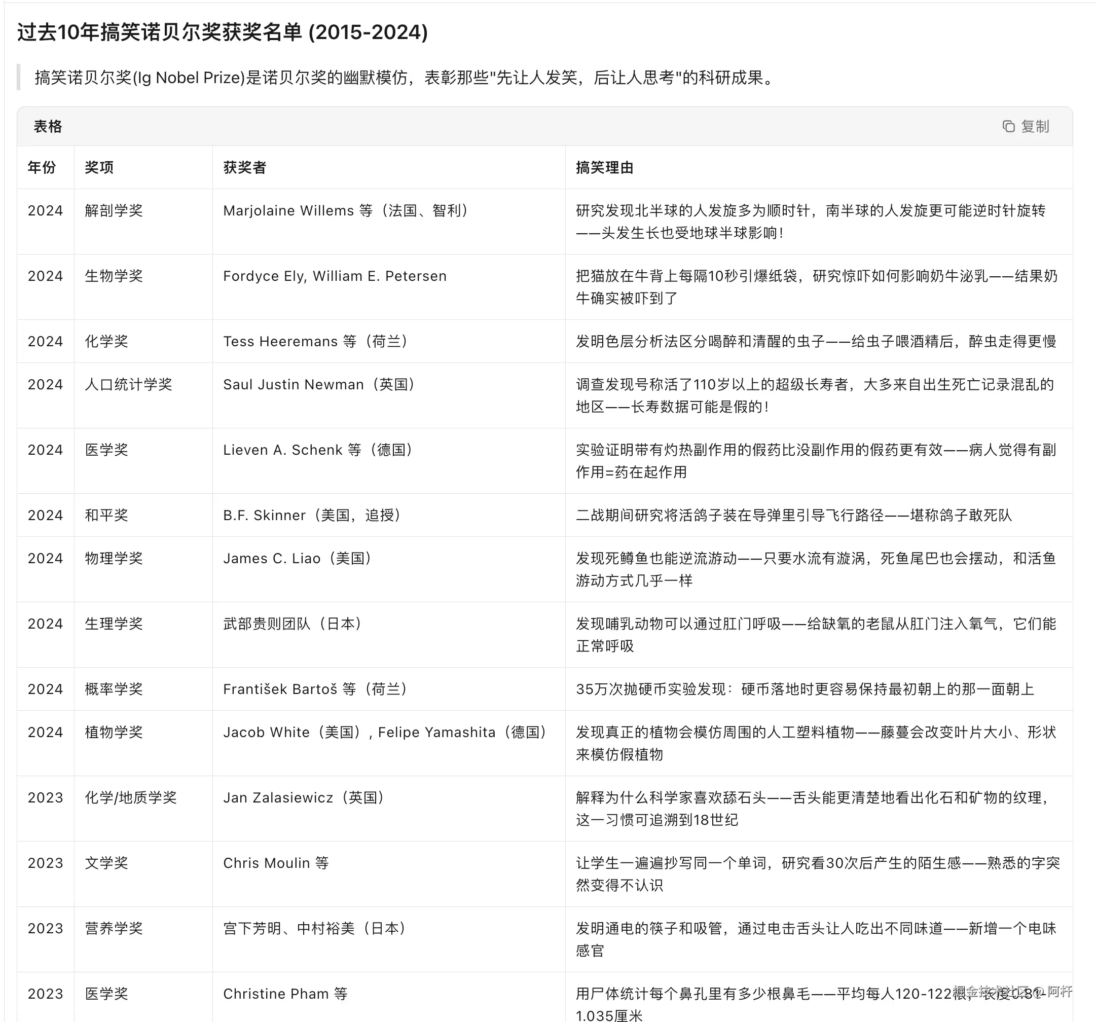帮我批量调研过去 10 年最奇葩的“搞笑诺贝尔奖”(Ig Nobel Prize),生成一个 Markdown 表格,列出年份、奖项、获奖者和搞笑理由。
