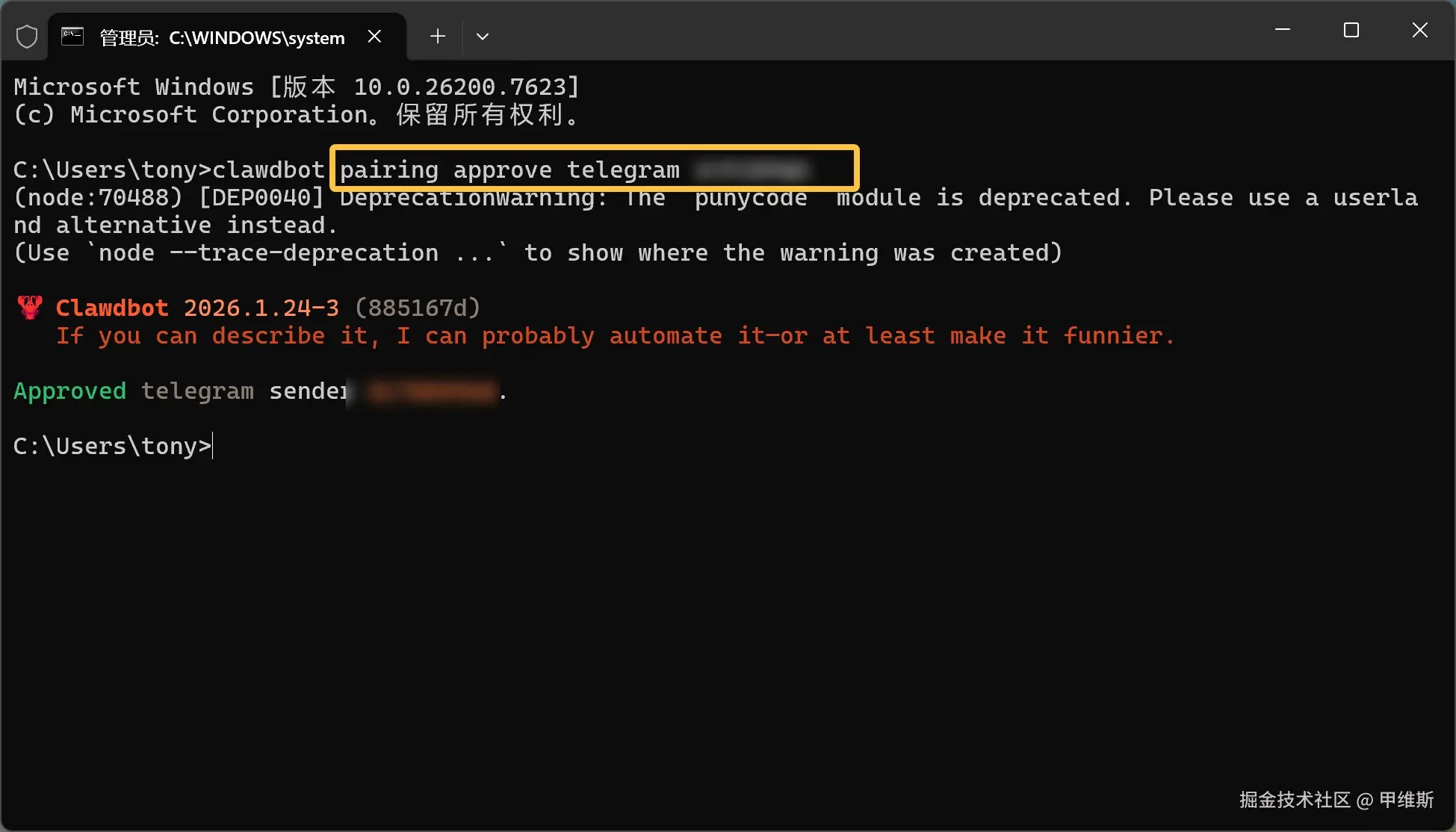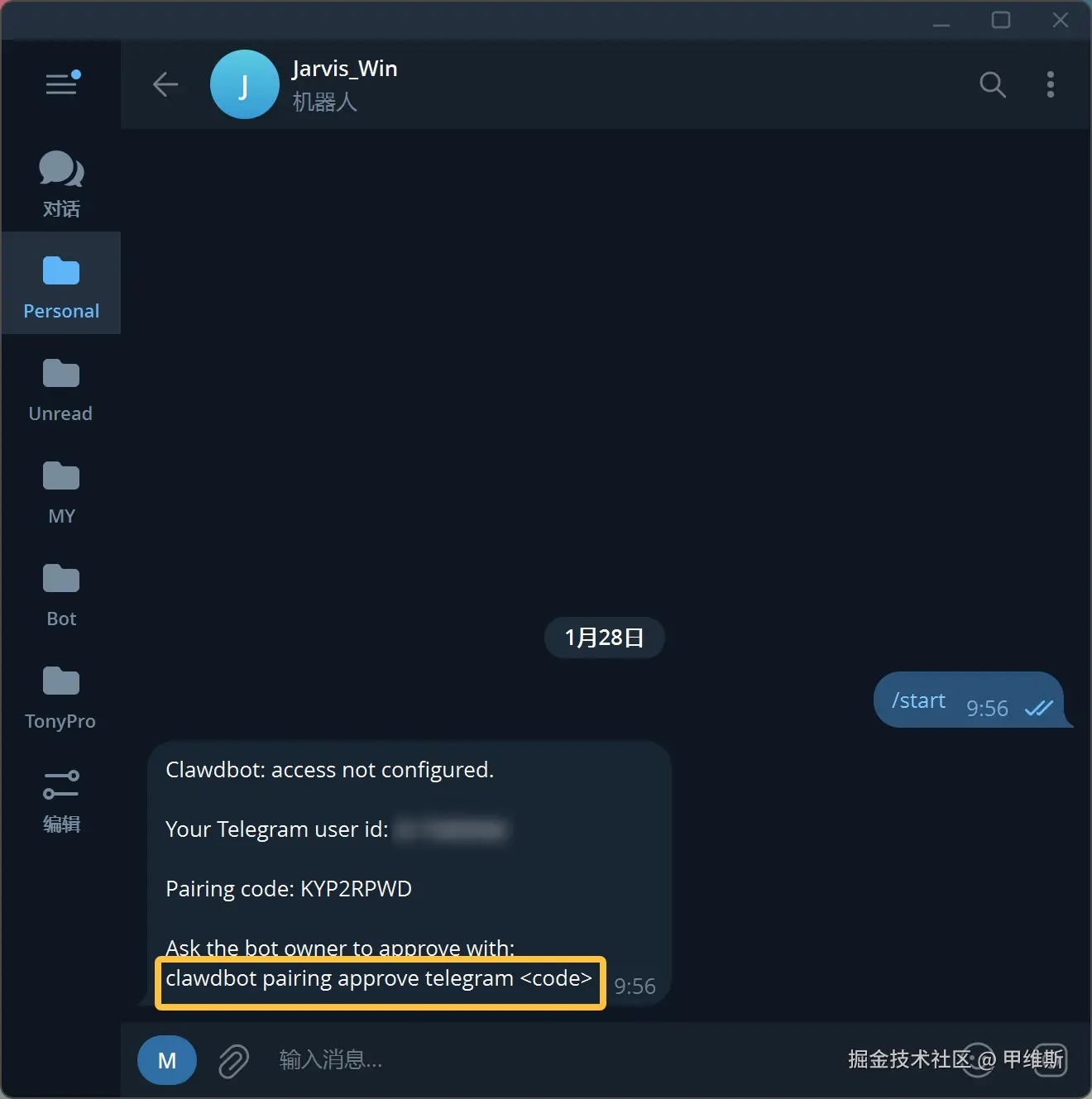 大概意思就是,权限受限,需要运行黄色框中的命令,才可以使用这个 TG 进行对话。
