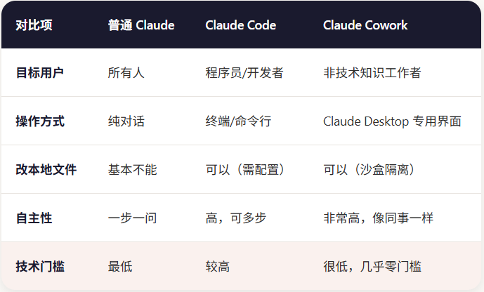 Claude Cowork 和 Claude Code 共享相同的基础架构,但定位和用户群体存在明显差异: