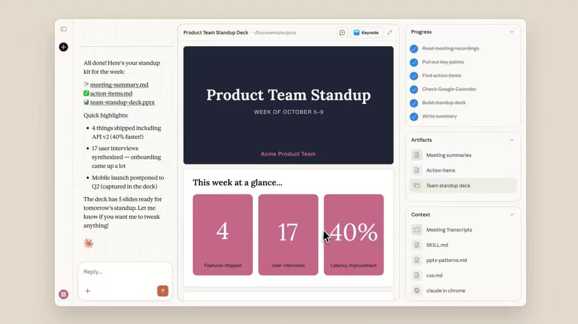 Cowork 集成了 Anthropic 的 Agent Skills 开放标准,允许 Claude 使用模块化的能力增强。初始技能包括文档生成、演示文稿创建、电子表格处理等,这些技能让 Cowork 在特定任务中表现出色。