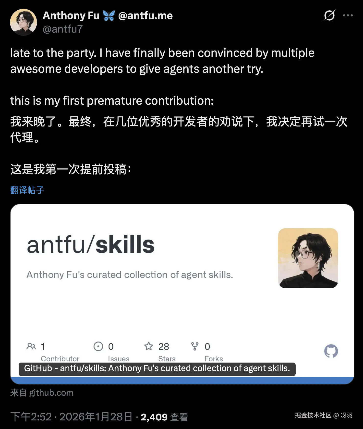 Vue 核心成员 Anthony Fu 发布了他的 skills: