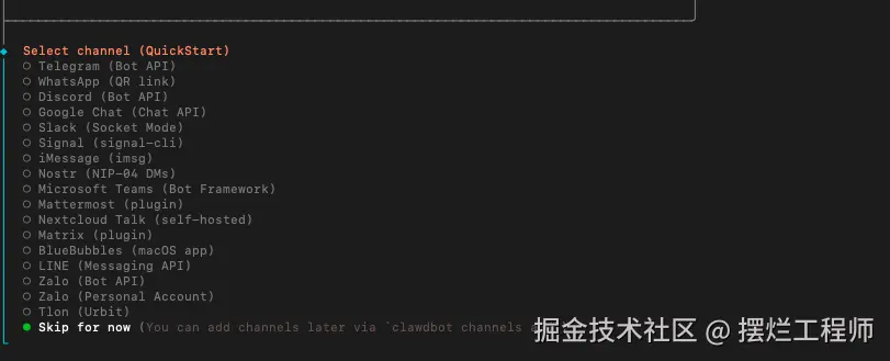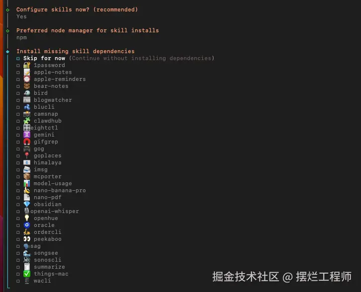 后面就会给你一些 Skills,你可以按需选择,或者先跳过也可以。 后续都可以安装的,直接跟 Clawdbot 说安装对应的 skills 就行。