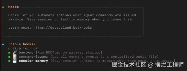 最后,问你需不需要开启钩子,这三个都是 Moltbot 的内置 hooks(钩子脚本),用来在特定事件发生时自动做事: