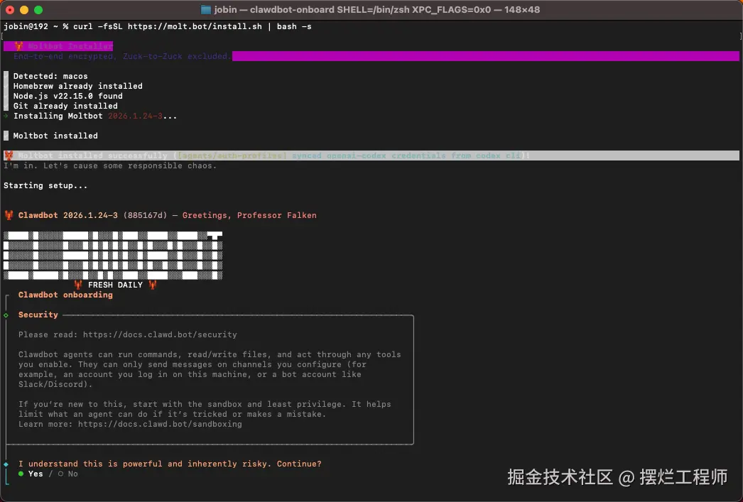 当你安装成功之后,会问你是否知道 Clawdbot 的风险很高,选择 yes 之后,就可以继续。